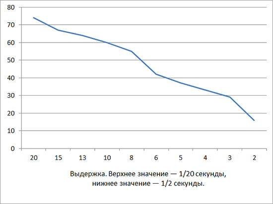 В качестве руководства по интерпретации данных на этом графике мы также предоставляем версию с цветовой кодировкой (показанную выше), которую вы можете увидеть, наведя курсор на (предыдущий) график. Цвет на графике представляет диапазоны, соответствующие приемлемо резким изображениям (зеленый), предельно резким (желтый) и непригодным для использования снимкам (красный). Посмотрев на относительную долю снимков, попадающих в зеленую полосу, вы можете получить приблизительное представление о том, сколько снимков было приемлемо резким при такой выдержке.Мы сознательно не представили порог резкости / размытости как конкретное соотношение хороших и плохих снимков при каждой выдержке по двум причинам. Во-первых, как упоминалось ранее, то, что составляет «приемлемое» размытие, может сильно различаться в зависимости от фотографа, объекта, используемого объектива и того, как будут использоваться фотографии.