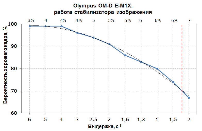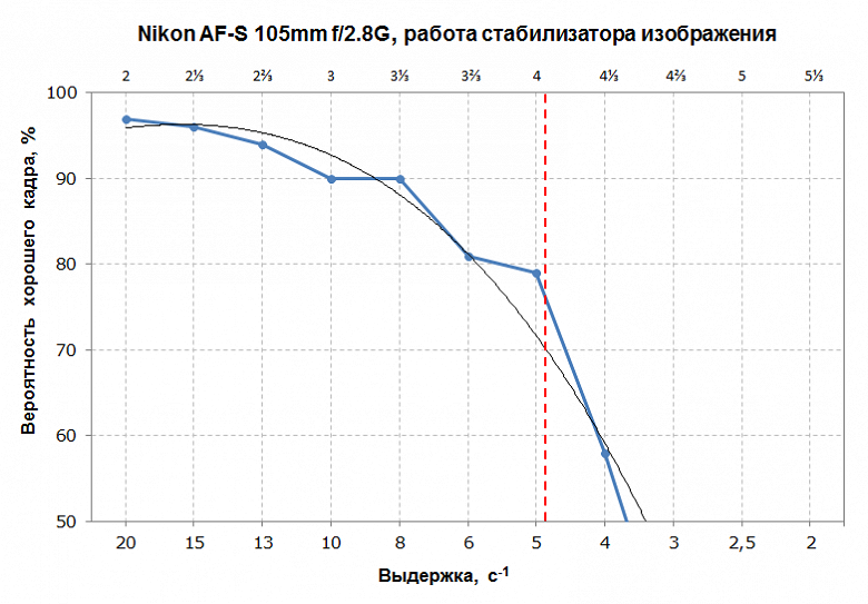 График выше дает хорошее общее представление о том, как система стабилизации изображения работает в диапазоне выдержек, по сравнению с тем, как человек, держащий камеру / объектив, обходился без стабилизации изображения.Однако для фотографических целей на самом деле интересны только нижние части графика. Таким образом, когда мы обсуждаем улучшение характеристик конкретного объектива, вы увидите график, подобный приведенному ниже: