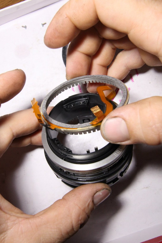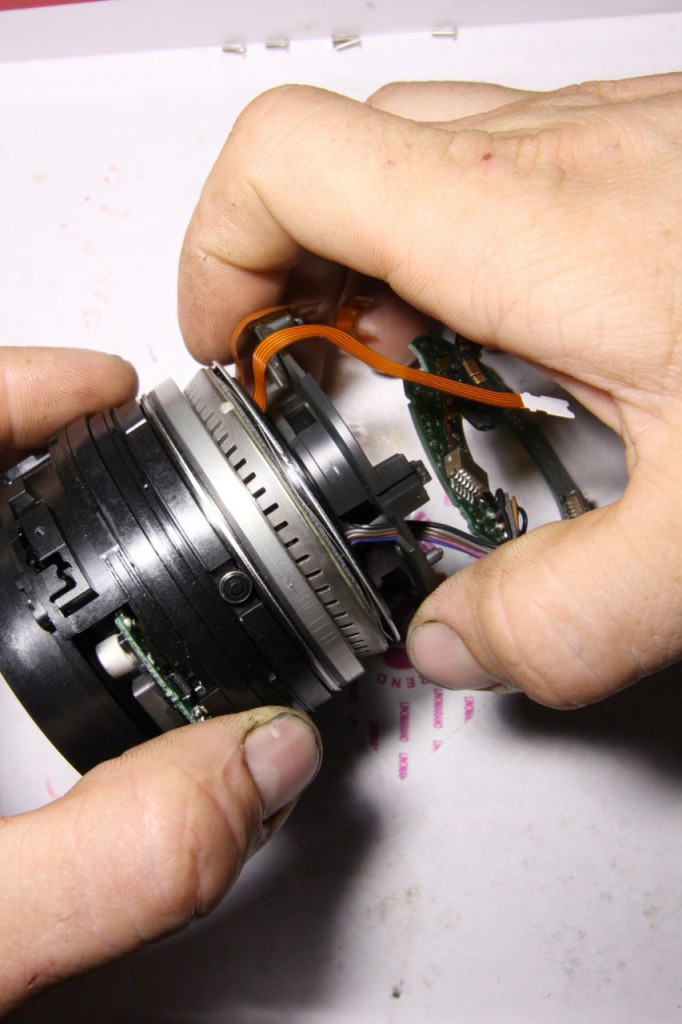 Дополнительные винты удерживают все остальные платы, и есть ряд кабелей, которые должны быть отсоединены. И вам также придется пройти через переднюю часть объектива, что потребует подъема накладного кольца с помощью spudger для доступа к трем винтам, удерживающим передний элемент на месте, и снятия резинового кольца для захвата, чтобы добраться до геликоида фокусировки.