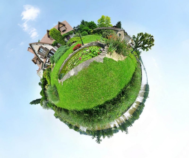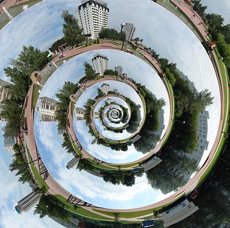 Вуаля! Ваша панорама теперь свёрнута в круг и выглядит как маленькая планета, сфотографированная сверху, с помощью объектива рыбий глаз.