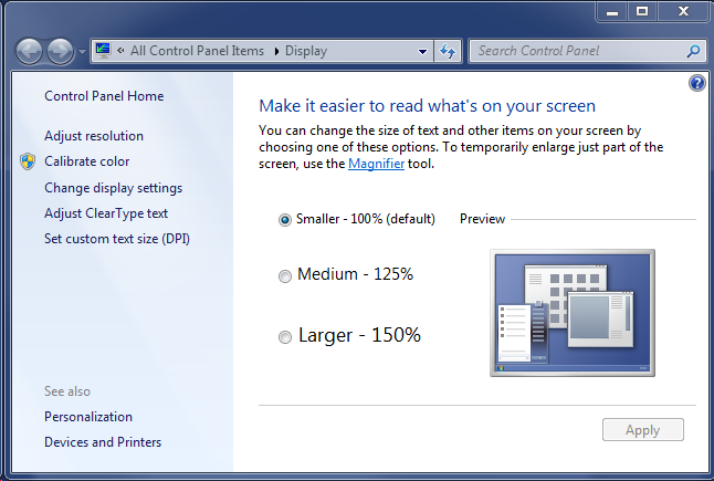ОС Windows обеспечивает соответствующий размер отображаемых на экране элементов, указывая приложениям изменить размер их содержимого с определенным коэффициентом масштаба. Windows по умолчанию устанавливает коэффициент масштаба 100% для большинства мониторов настольных компьютеров и ноутбуков, обычно поддерживающих DPI в диапазоне 95–110 точек на дюйм.