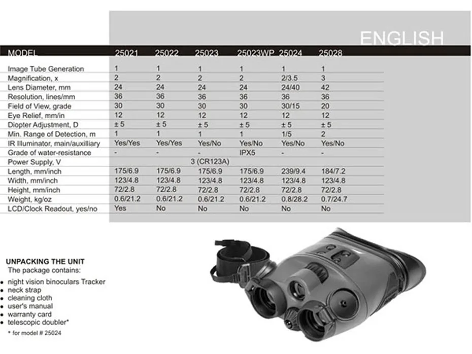 Главное преимущество бинокля ночного видения перед тепловизором — низкая цена. Большой зум в ночных биноклях не требуется. Обычно они используются в комплекте с источником инфракрасного освещения.