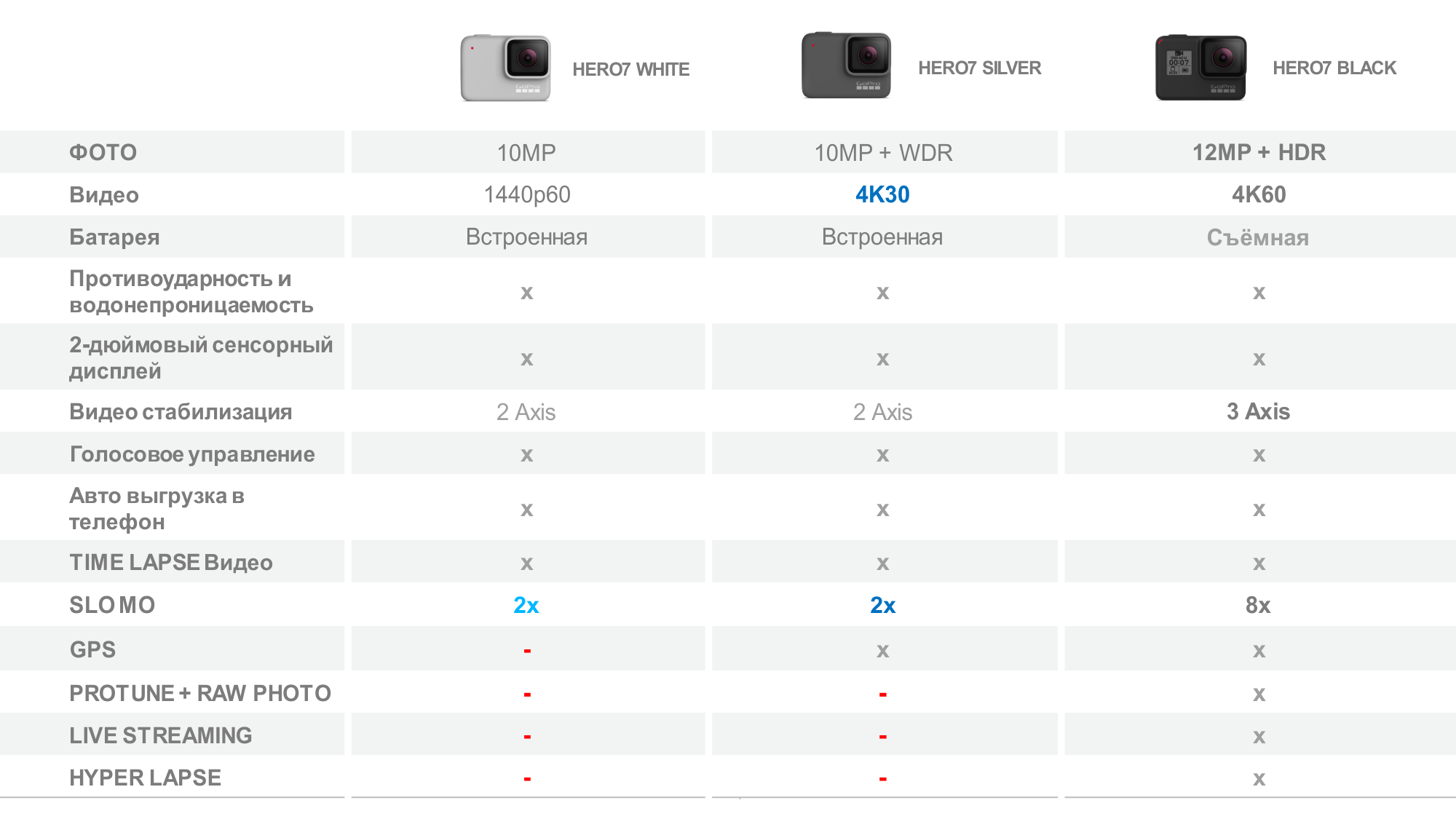 Характеристики камер: