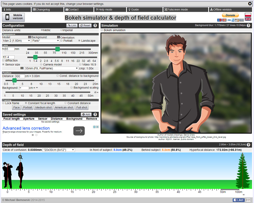 Подробная математика, которую я реализовал в этой таблице, описана в этой статье Википедии http://en.wikipedia.org/wiki/Depth_of_field. Хотя я сделал все возможное, чтобы избежать ошибок, и протестировал инструмент, сравнив результаты с результатами других калькуляторов, возможно, некоторые ошибки остались. Если вы обнаружите какие-либо ошибки или у вас есть предложения по улучшению, свяжитесь со мной, и я сделаю все возможное, чтобы их исправить.