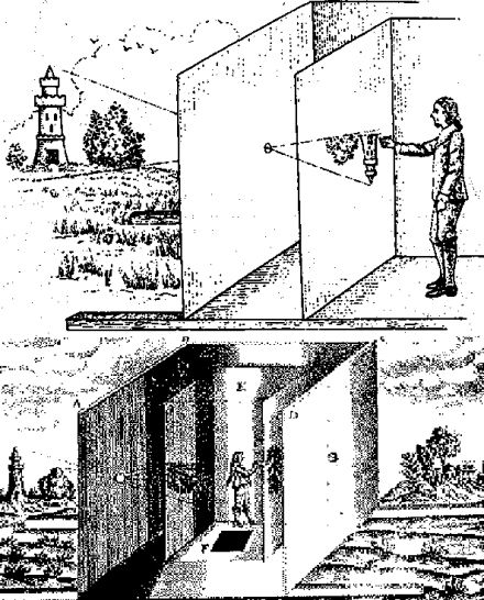 Π‘ΡΠ΄Ρ ΠΏΠΎ Π²ΡΠ΅ΠΌΡ, ΠΏΠ΅ΡΠ²ΡΠΌ ΠΈΡΠΏΠΎΠ»ΡΠ·ΠΎΠ²Π°Π» ΠΊΠ°ΠΌΠ΅ΡΡ-ΠΎΠ±ΡΠΊΡΡΡ Π΄Π»Ρ Π·Π°ΡΠΈΡΠΎΠ²ΠΎΠΊ Ρ Π½Π°ΡΡΡΡ ΠΠ΅ΠΎΠ½Π°ΡΠ΄ΠΎ Π΄Π° ΠΠΈΠ½ΡΠΈ. ΠΠ½ ΡΠ°ΠΊΠΆΠ΅ ΠΏΠΎΠ΄ΡΠΎΠ±Π½ΠΎ ΠΎΠΏΠΈΡΠ°Π» Π΅Ρ Π² ΡΠ²ΠΎΡΠΌ Β«Π’ΡΠ°ΠΊΡΠ°ΡΠ΅ ΠΎ ΠΆΠΈΠ²ΠΎΠΏΠΈΡΠΈΒ». Π 1686Β Π³ΠΎΠ΄Ρ ΠΠΎΠ³Π°Π½Π½Π΅Ρ Π¦Π°Π½ ΡΠΏΡΠΎΠ΅ΠΊΡΠΈΡΠΎΠ²Π°Π» ΠΏΠΎΡΡΠ°ΡΠΈΠ²Π½ΡΡ ΠΊΠ°ΠΌΠ΅ΡΡ-ΠΎΠ±ΡΠΊΡΡΡ, ΠΎΡΠ½Π°ΡΡΠ½Π½ΡΡ Π·Π΅ΡΠΊΠ°Π»ΠΎΠΌ, ΡΠ°ΡΠΏΠΎΠ»ΠΎΠΆΠ΅Π½Π½ΡΠΌ ΠΏΠΎΠ΄ ΡΠ³Π»ΠΎΠΌ 45Β° ΠΈ ΠΏΡΠΎΠ΅ΡΠΈΡΠΎΠ²Π°Π²ΡΠΈΠΌ ΠΈΠ·ΠΎΠ±ΡΠ°ΠΆΠ΅Π½ΠΈΠ΅ Π½Π° ΠΌΠ°ΡΠΎΠ²ΡΡ Π³ΠΎΡΠΈΠ·ΠΎΠ½ΡΠ°Π»ΡΠ½ΡΡ ΠΏΠ»Π°ΡΡΠΈΠ½Ρ, ΡΡΠΎ ΠΏΠΎΠ·Π²ΠΎΠ»ΠΈΠ»ΠΎ Ρ