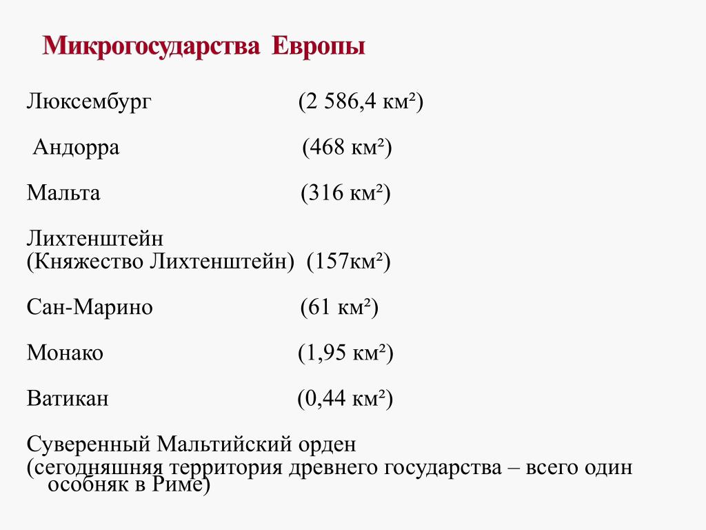 Карликовые государства мира список: список по площади и численности населения