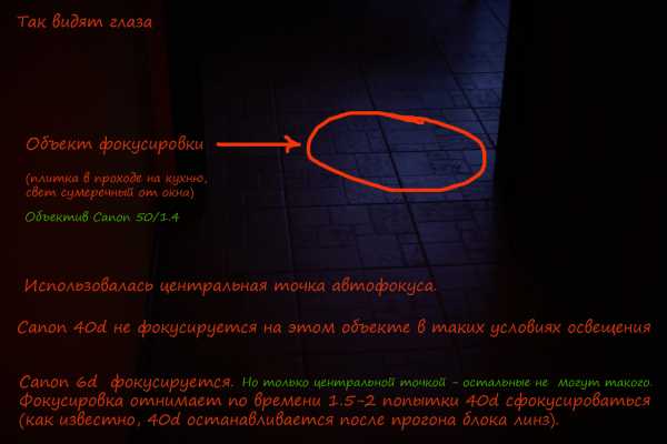 Опишу, что происходит в такой темноте. 40д прогоняет блок линз в одну сторону, потом возвращает их назад, затем останавливался, так и не достигнув цели, оставляя её в совершенно расфокусированном виде. Навсегда. 6д на указанных объектах начинает с того же, но в процессе движения блока линз невооружённым ухом слышно, что цель ему всё-таки видна, и тогда он останавливается, и делает смещение блока линз на обнаруженное в ходе предыдущей проводки место, затем перепроверяется и, наконец, мы слышим и видим сигнал подтверждения. По времени это занимает в зависимости от специфики освещённости и вида объекта от мгновенного срабатывания и вплоть до 2-х времён поиска (безуспешного, но имеющего интервал времени, равный проводке туда и назад) камеры 40д в наиболее сложных для него случаях. Само собой, всегда найдутся такие мишени, которых не видит даже 6д. Это лишь говорит о том, что фотографу нужно будет всё ещё знать меру в желании расслабиться и доверить всё камере – придётся всё же найти в темноте нечто, за что 6д зацепится. Но повторяю, речь об условиях, где 40д уже никак не может, а 6д очень даже может. И если он Вам сигнализирует, что может, то результат оправдает ожидания.