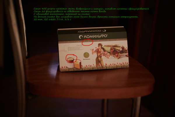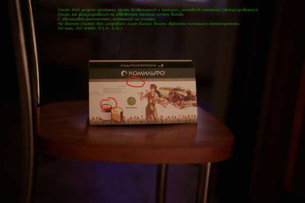 Теперь поговорим о точности попадания. Ведь никому не интересно подтверждение фокусировки, которое в итоге обернулось бы остановкой ГРИП не на желаемом объекте. Сначала фотография условий. Замечу, что на самом деле коробка была темнее, чем выглядит на снимке, стул примерно так же, а вот окружающее пространство было чуть светлее. Но в целом можно представить, что там, по идее, с АФ ловить нечего. И 40д совершенно правомерно отказывался наводиться, несмотря на мои тщательные попытки. 6д не на всё реагировал, но обведённые участки схватывал достаточно резво для таких условий и делал это весьма эффективно, поскольку ВСЕ сделанные снимки попали в цель. Приведу два из всех. С немного разным расстоянием до цели.