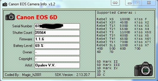 ΠΠΎΠΆΠ½ΠΎ ΠΏΠΎΠΏΡΠΎΠ±ΠΎΠ²Π°ΡΡ ΠΏΡΠΎΠ²Π΅ΡΠΈΡΡ ΠΎΠ±ΠΎΡΡΠ΄ΠΎΠ²Π°Π½ΠΈΠ΅ ΠΏΡΠΈ ΠΏΠΎΠΌΠΎΡΠΈ ΡΠΏΠ΅ΡΠΈΠ°Π»ΡΠ½ΠΎΠ³ΠΎ ΠΏΡΠΈΠ»ΠΎΠΆΠ΅Π½ΠΈΡ EOSInfo. ΠΡΠΎΠ³ΡΠ°ΠΌΠΌΠ° ΡΠ°Π±ΠΎΡΠ°Π΅Ρ Π² ΠΎΡΡΠ»Π°ΠΉΠ½ΠΎΠ²ΠΎΠΌ ΡΠ΅ΠΆΠΈΠΌΠ΅. Π‘ΡΡΠ΅ΡΡΠ²ΡΠ΅Ρ Π΄Π²Π΅ Π²Π΅ΡΡΠΈΠΈ, Π΄Π»Ρ ΡΠ°Π·Π½ΡΡ