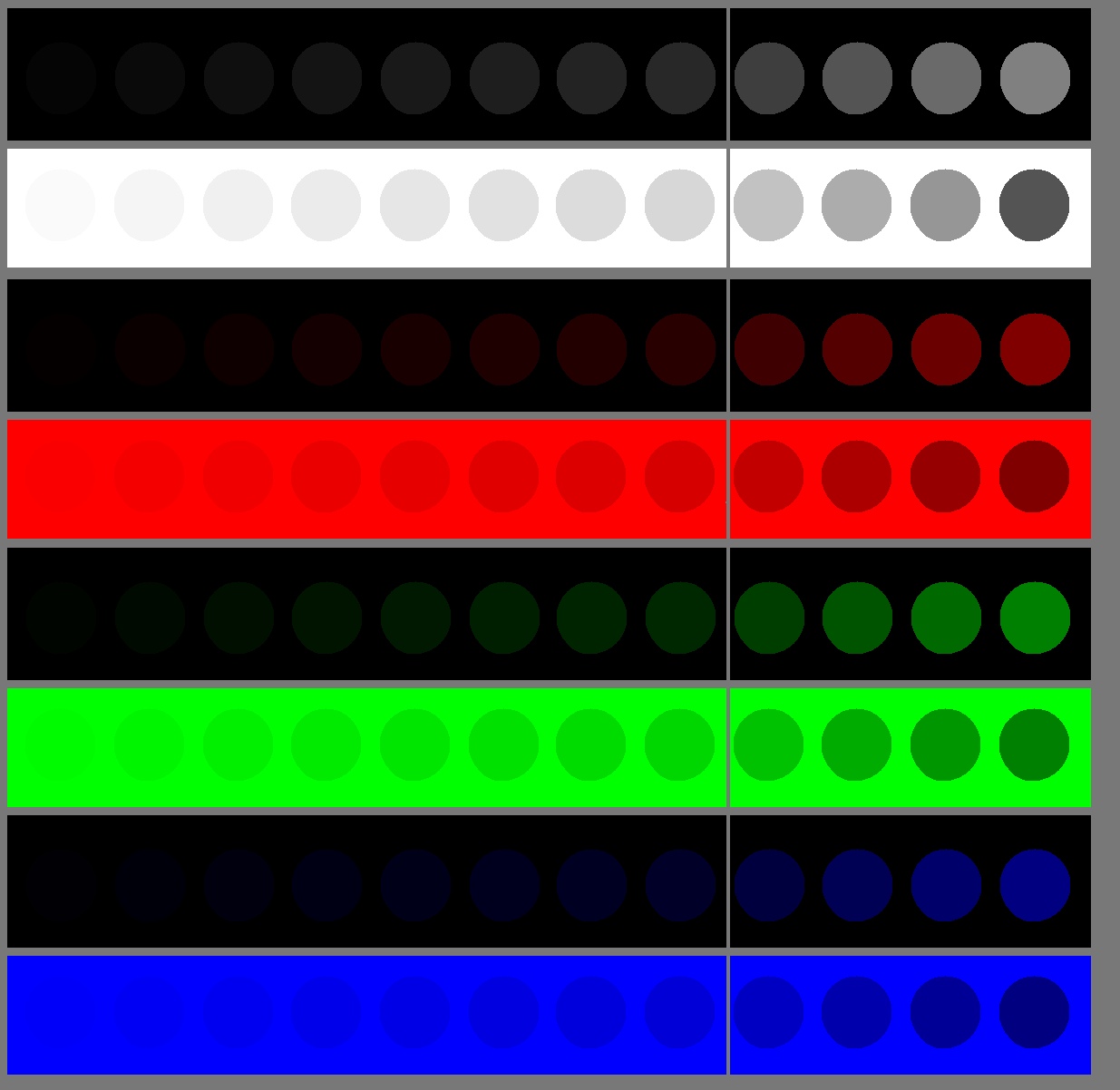 На рисунках 23…28 представлены три пары дополнительных цветов и их смеси, позволяющие получить серый тон. Цветовая градация полос, образованных при смешении каждой пары дополнительных цветов, определяется постепенным увеличением количества цвета, добавляемого к основному. При этом в центре каждого из этих рядов возникает тот нейтральный серый, который свидетельствует, что данная пара цветов является дополнительной.
