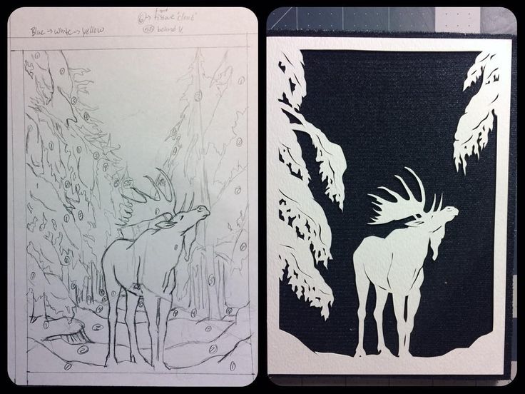 - Если вы решили воспользоваться собственным эскизом, перенесите его любым удобным способом на листы бумаги для вырезания. Сделайте рисунок на оборотной стороне листа, чтобы картина смотрелась аккуратно.