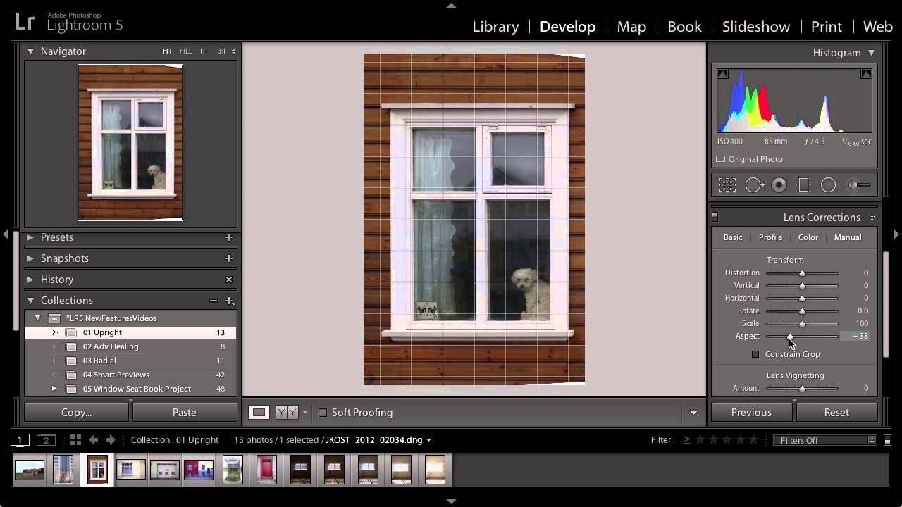Вертикальное положение (модуль «Разработка» > «Коррекция объектива» > вкладка «Основные») позволяет автоматически выпрямлять содержимое изображения. Вертикальное положение автоматически корректирует перспективу элементов фотографии.