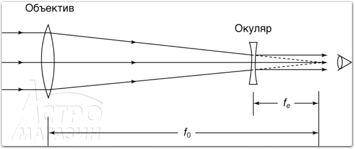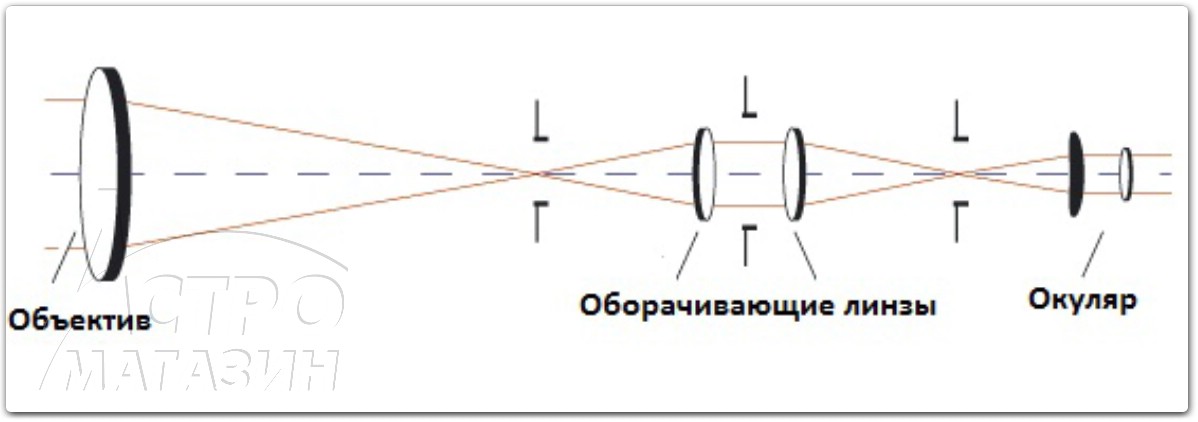 Лучи от удаленного предмета, параллельные оси телескопа (лучи a и c на схеме), собираются в заднем фокусе первой линзы (объектива). Вторая линза (окуляр) удалена от фокальной плоскости объектива на свое фокусное расстояние, и лучи a и c выходят из нее вновь параллельно оси системы. Некоторый луч b, исходящий не из тех точек предмета, откуда пришли лучи a и c, падает под углом a к оси телескопа, проходит через передний фокус объектива и после него идет параллельно оси системы. Окуляр направляет его в свой задний фокус под углом b.