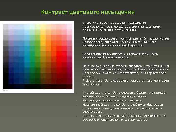Говоря о «качестве цвета», мы имеем в виду его чистоту и насыщенность. Слова «контраст по насыщенности» фиксируют противоположность между цветами насыщенными,чистыми и блеклыми, приглушенными. Спектральные цвета, полученные путем преломления белого света, являются цветами максимальной насыщенности или максимальной чистоты.