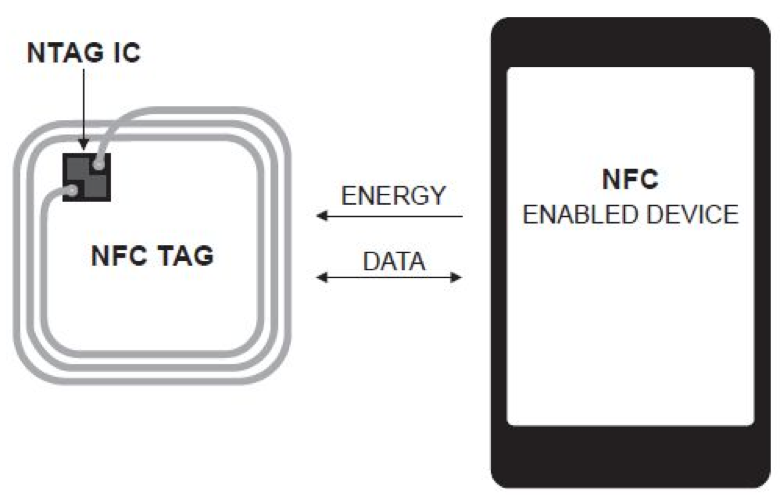 При индуктивной связи электромагнитное поле на частоте 13,56 мегагерц генерируется активным передающим устройством с поддержкой NFC, и тег NFC использует это в качестве источника питания. Такой способ сбора энергии устраняет необходимость во внутреннем источнике питания, таком как аккумулятор и аккумуляторный отсек.
