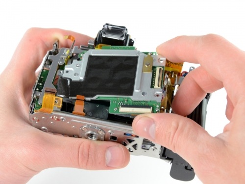 В процессе разборки была демонтирована материнская плата, 16,2-мегапиксельный КМОП-сенсор (размер одного пикселя, согласно Chipworks, составляет 4,8 микрометров, что вдвое меньше эритроцита), а также все остальные компоненты – дело даже дошло до отпаивания некоторых проводов. На материнской плате, среди чипов Nikon и процессора обработки изображений Nikon EXPEED 2 EI-154 1051 Z05 также обнаружились три модуля памяти Samsung DDR2-800 общей емкостью 384 Мбайт.