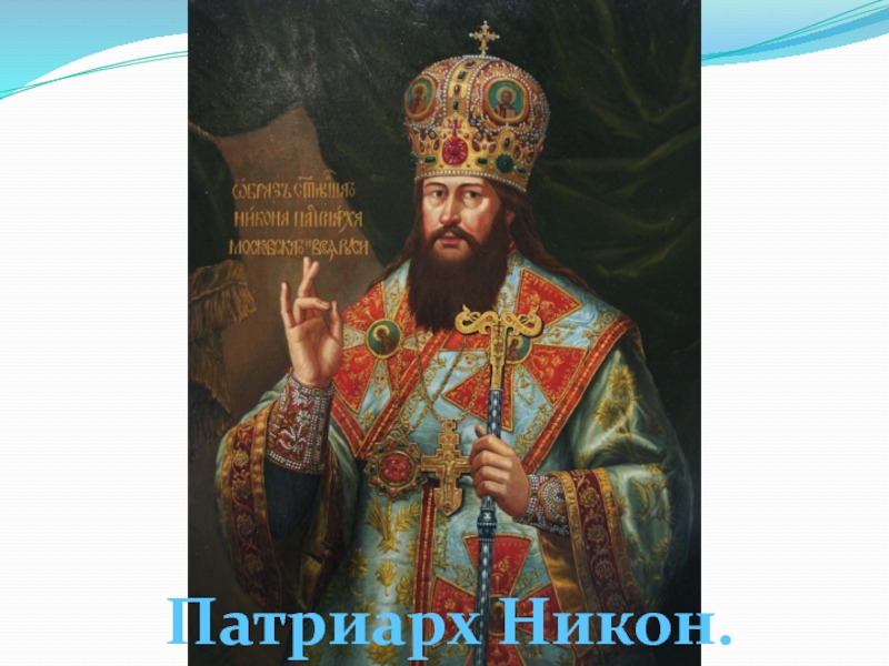 Вдоль верхнего края портрета — надпись: «СВЯТЕIШИЙ НИКОНЪ ПАТРИАРХ МОСКОВСКIЙ И ВСЕЯ РОССИИ».