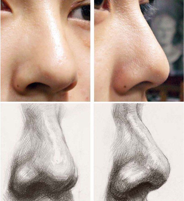 После того, как вы закончите свой первый рисунок носа, убедитесь, что вы немного придержали бумагу, чтобы получить некоторую перспективу. Сравните свою работу с эталоном, чтобы увидеть, есть ли изменения, которые вы хотите внести.