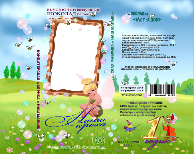 Остаётся написать название и состав шоколада. На подарочный фантик можно добавить любые тёплые слова. Но так как наша девочка ещё плохо умеет читать, текстом злоупотреблять не будем.