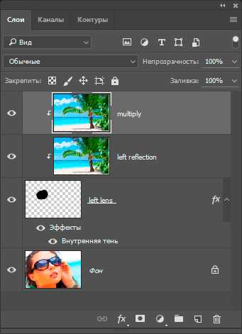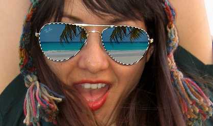 Чтобы добавить обтравочную маску, к слою «left reflection», выбранного на данный момент в панели слоев, нажмите сочетание клавиш Alt+Ctrl+G. Теперь изображение тропического пляжа осталось только внутри левого стёкла очков: