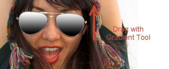 Чтобы закончить работу с левым стеклом очков и придать отражению трехмерный, изогнутый вид, давайте добавим на стекло солнечного блика. Я собираюсь добавить его в правом верхнем углу стёкла очков. Чтобы это сделать, нам потребуется инструмент «Градиент» (Gradient Tool), так выберите его на панели инструментов.