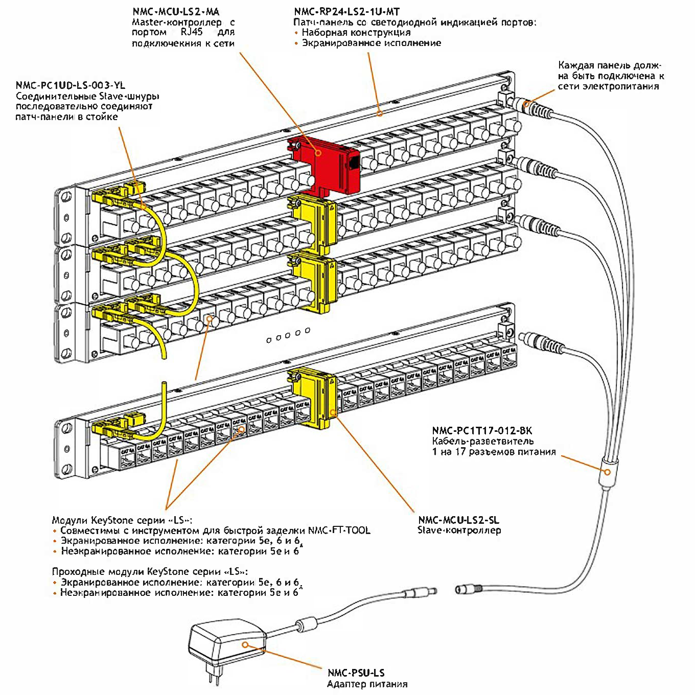 Панели можно монтировать в стандартных 19-дюймовых или 23-дюймовых стойках. Аппаратный узел патч-панели содержит пустые порты с одной стороны и точку подключения с другой.