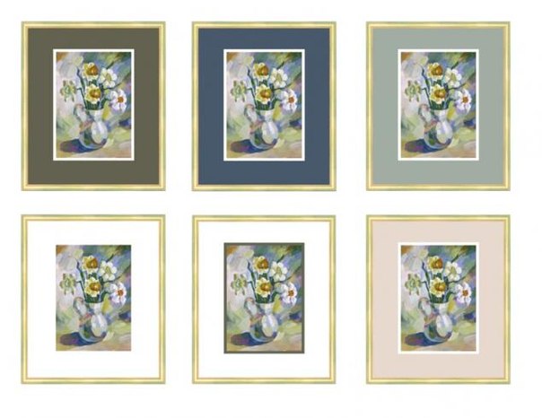 При подборе багета нужно определить, на какие детали на картине по цвету хотелось бы акцентировать внимание и под них по цвету подбирать багет или паспарту.