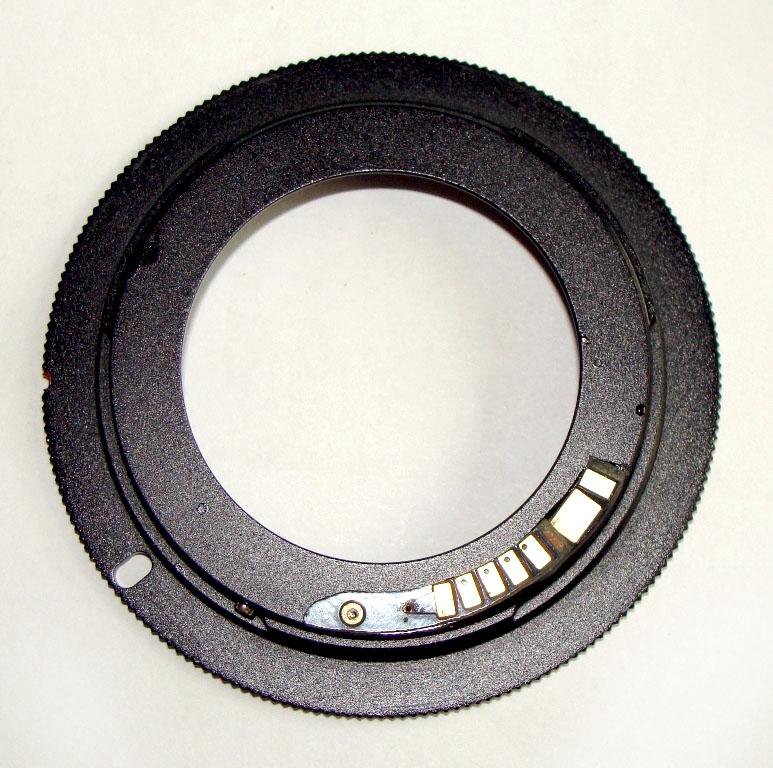 Переходник на eos без чипа. Самый дешевый, но не самый удобный вариант. Представляет собой железку без каких либо технических наворотов. Идеален для видеосъемки, но неудобен для фотографии.К сожалению я этого не знал. Поэтому и не обратил внимания на то, программируемый он или нет. Но это не значит что адаптер плохой. Им вполне можно пользоваться-самую главную функцию, по подтверждению фокусировки он выполняет. В будущем, возможно я попробую заказать адапетр с программируемым чипом, но возможно и данный меня устроит.