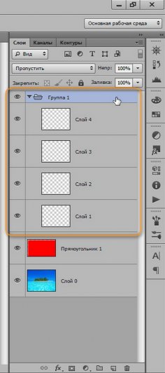 Слои, являющиеся частью группы слоев, отображаются в палитре слоев, а их миниатюры выравниваются под символом папки.