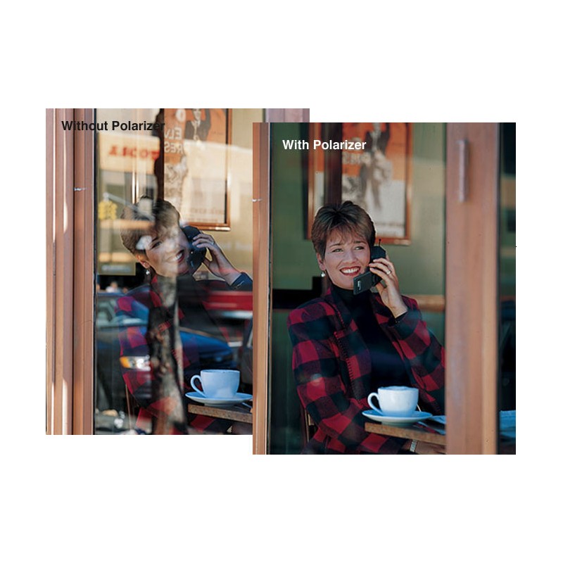 Поляризационный светофильтр увеличивает на фотографии визуальную резкость и чистоту цвета. Так, при пейзажной съемке листва деревьев, кроме собственного диффузного отражения, имеет также зеркальное отражение синего света неба. Поляризационный светофильтр позволяет устранить бликующую засветку. За счет этого на фотографии лучше проявляется собственный цвет предметов, увеличивается насыщенность цвета, и с листьев исчезает голубоватый оттенок. Уменьшение засветки кадра рассеянным светом немного увеличивает контраст, что приводит к визуальному увеличению резкости.