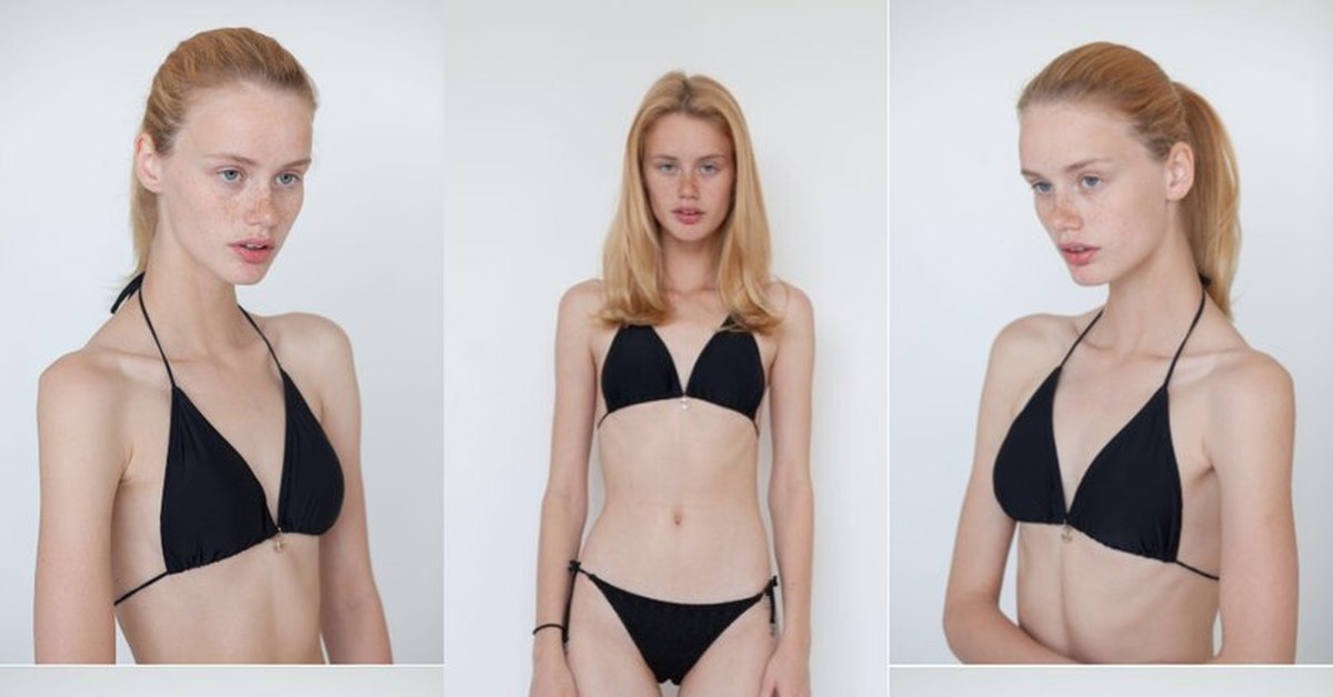 в полный рост: в открытом купальнике или белье анфас, профиль и со спины.