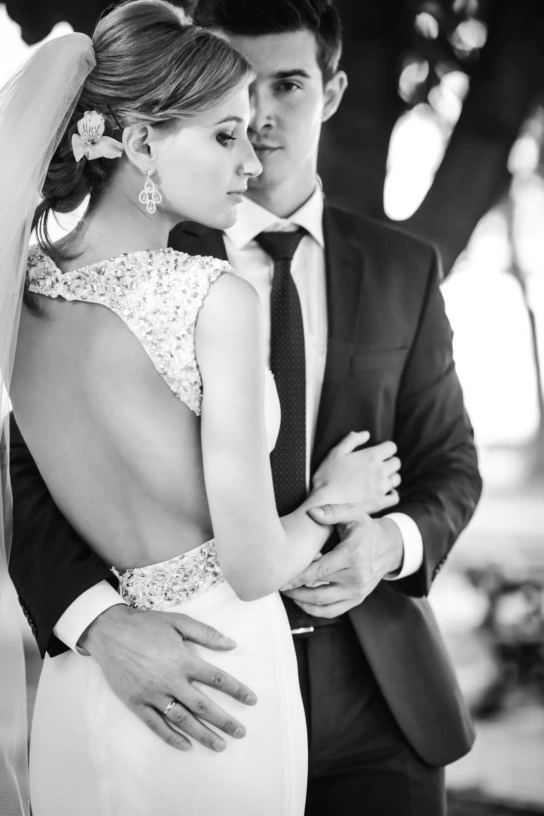 Попросите жениха обнять невесту сзади, чтобы она к нему немного повернулась. Если они поцелуют друг друга в этот момент то вообще замечательно. Но можно и просто посмотреть друг другу в глаза.