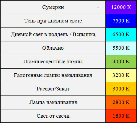 Пламя свечи имеет цветовую температуру около 1800 К, лампы накаливания — 2500 К, восход солнца — 3800 К, лампа-вспышка — 5500 К, голубое безоблачное небо в летний день — 11000 К и выше.