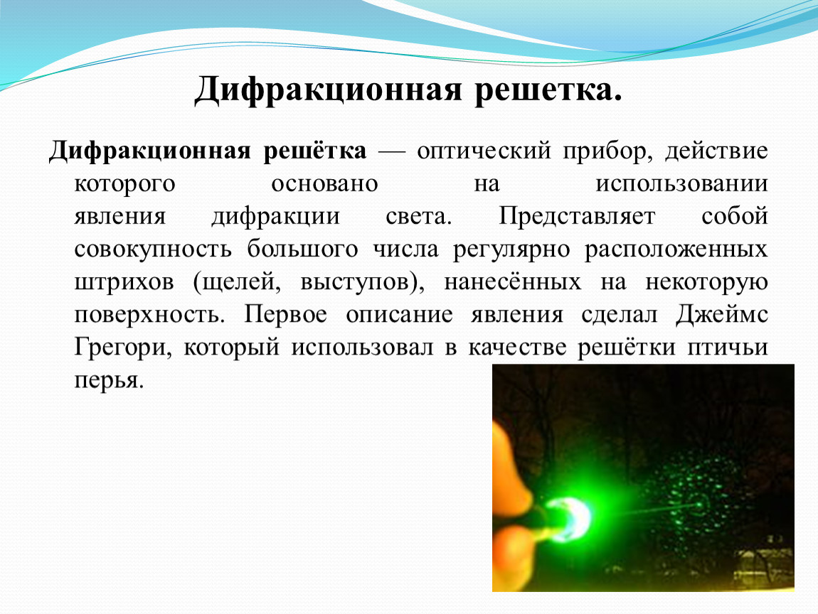 Дифракционная решетка — это специальный оптический прибор, представляющий собой ряд штрихов, задерживающих световой поток.