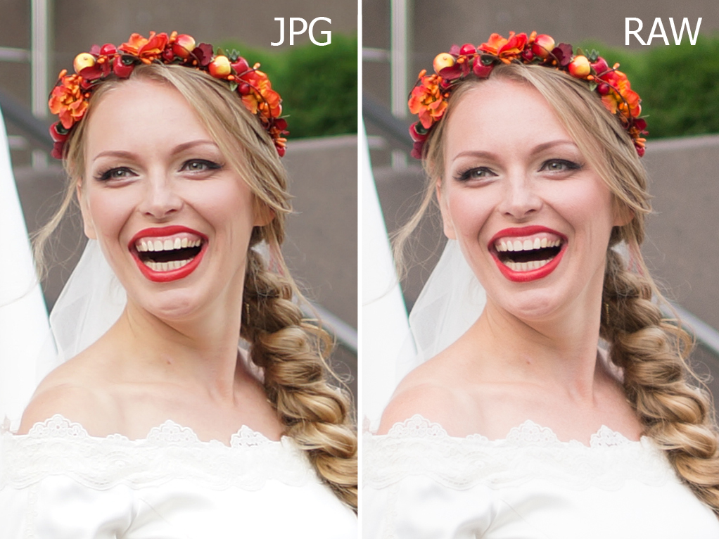 Пиксели RAW содержат 12–16 бит информации о цвете, что позволяет более тонкие цветовые вариации. Пиксели JPEG имеют восемь битов, что почти все, что может различить человеческий глаз.