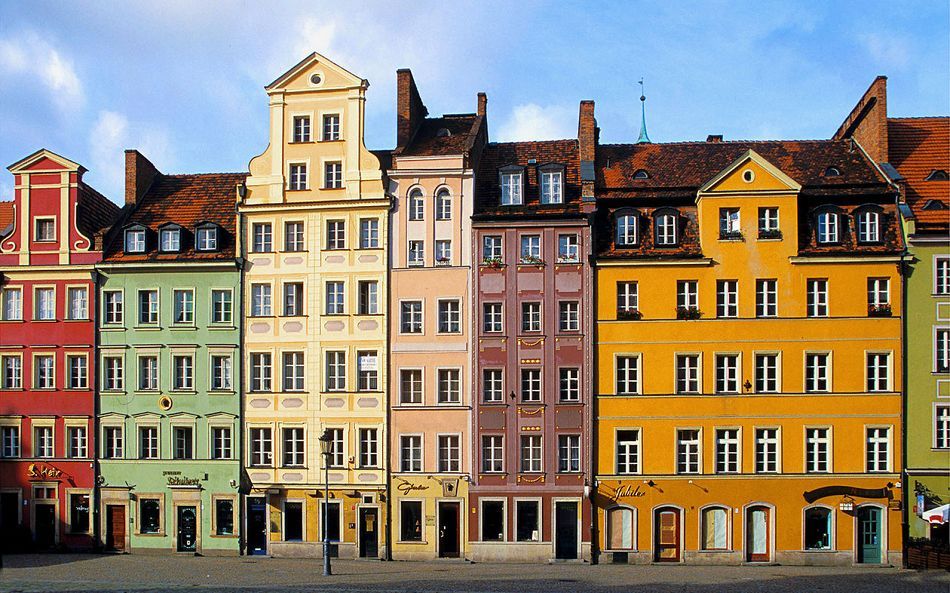 Вроцлав расположен на реке Одер на юго-западе Польши, недалеко от границ Германии и Чехии. Он наиболее известен своей средневековой рыночной площадью, окруженной зданиями, окрашенными во множество оттенков. Рынок был основан Генрихом Бородатым между 1214 и 1232 годами, а дома богатых купцов и ратуши — их две — были добавлены со временем, одна роскошнее и более украшенная, чем другая. Дело не только в том, что каждый дом разного цвета, многие из них многоцветны, например, темно-красный дом с бирюзовыми рамами на окнах и розовыми деталями внутри рам. Это как средневековая сцена прямо из кондитерской.