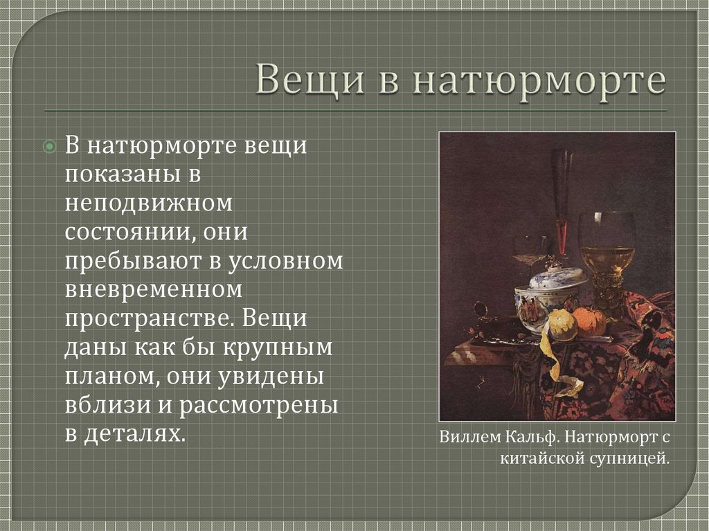 Натюрморт – это почти всегда группа вещей, связанная общим смыслом. В эту группу могут входить и объекты из живой природы, но изолированные от своей естественной среды, превращённые в вещь: рыба на столе, ваза с цветами или фруктами, и так далее. Иногда в композицию натюрморта входит изображение и живых элементов: птиц, животных, насекомых, людей, но они лишь дополняют основную мысль картины.