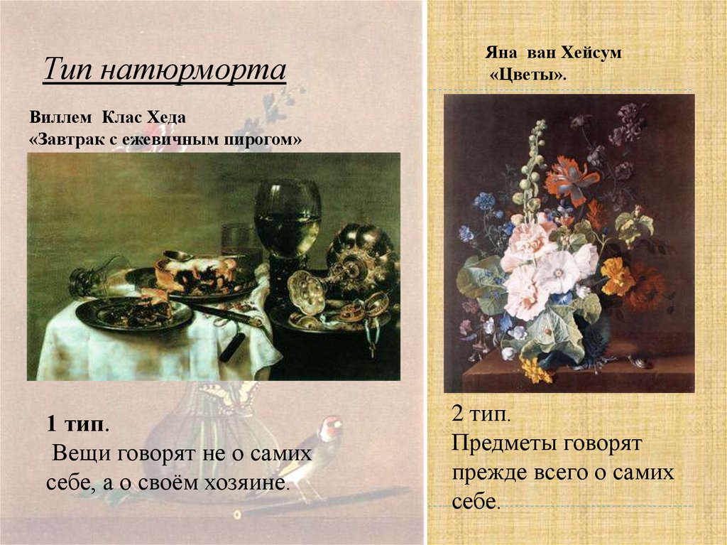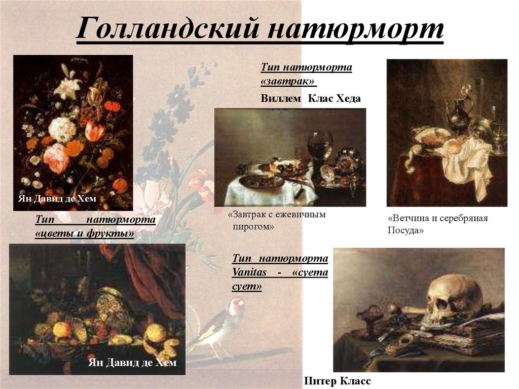 Предметы, изображённые на картинах того времени часто скрывают в себе некую философскую аллегорию – неизбежность смерти и быстротечность всего земного, или же более широкие смыслы религиозных сюжетов. Но большую популярность приобретает и цветочный натюрморт – это напрямую связано с традициями Голландии: собственные сады, загородные виллы, просто комнатные растения, любовь к цветоводству вообще присуща этой стране. Пример голландского цветочного натюрморта – это роскошные композиции, автором которых был живописец Ян Давидс де Хем.