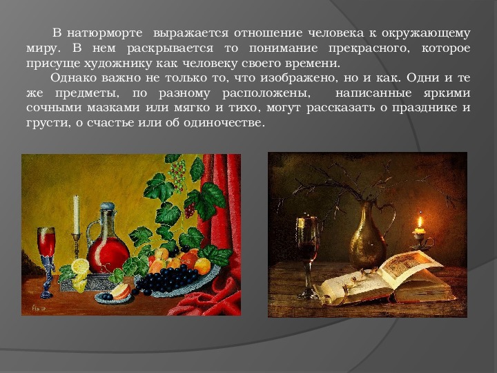 Натюрморт выделяет предметы из общего контекста быта, привлекает повышенное внимание к мельчайшим деталям и структуре поверхностей, заставляет удивиться красоте обычных вещей и природных форм, которые чаще всего человек не даёт себе труда рассмотреть, скользя по ним поверхностным взглядом.