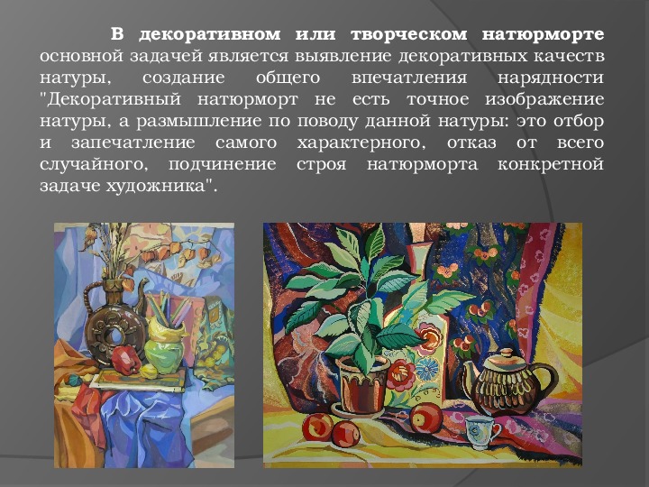 Под декоративным натюрмортом часто понимают весьма произвольное обращение с натурой, приводящее к ничем не оправданному её искажению, поскольку незнание закономерностей работы над этим жанром влечет за собой массу ошибок. Декоративная живопись, так же как и академическая, основана на строгих законах и принципах. А умение перевести изображаемую натуру из видимого трехмерного в двухмерное пространство и при этом успешно решать творческие, композиционные и живописные задачи необходимо всем художникам высокого уровня, т. к. их работы призваны украшать множество интерьеров.