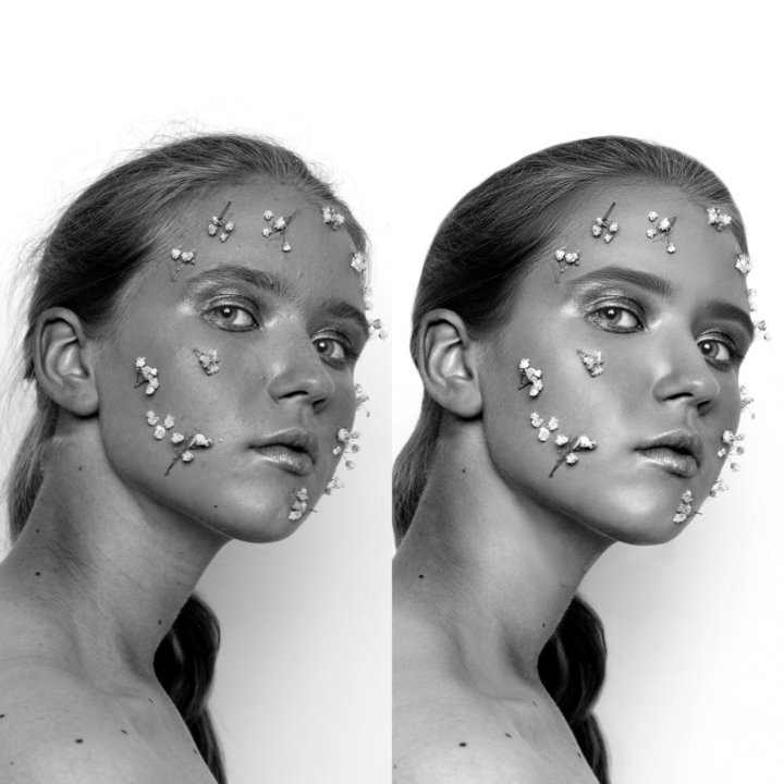 Разложив фотографию на две частоты, фотограф работает отдельно с мелкой текстурой и светотенью. Это позволяет аккуратно разгладить кожу, но оставить поры; убрать прыщики, но сохранить нетронутым цвет.