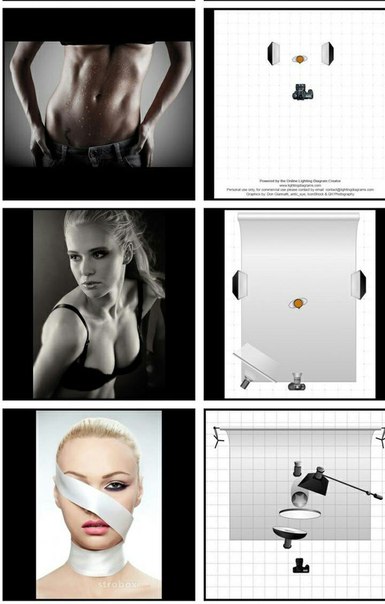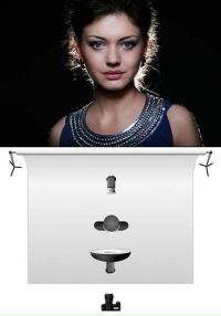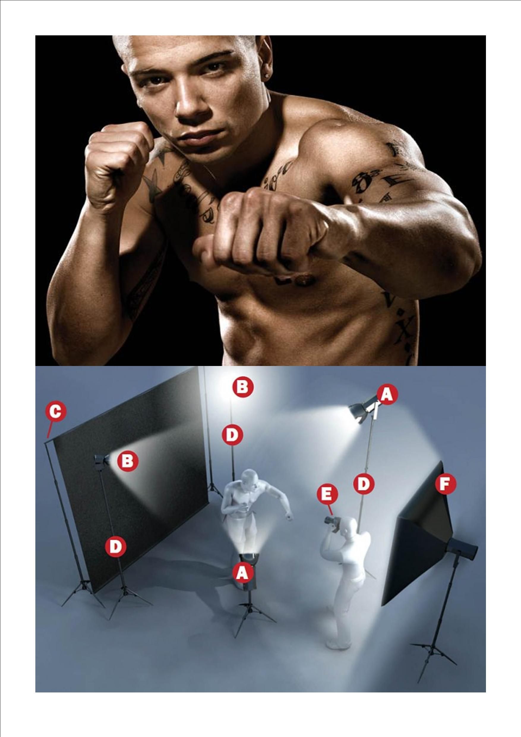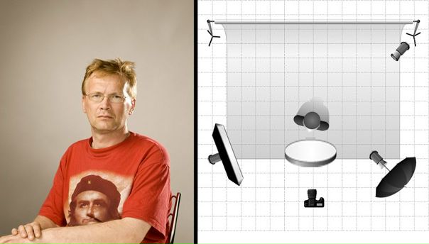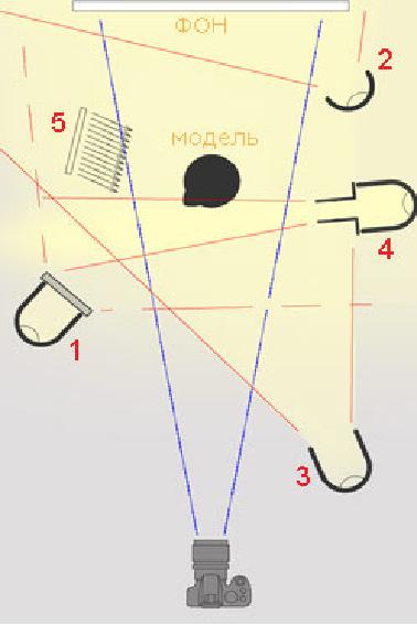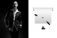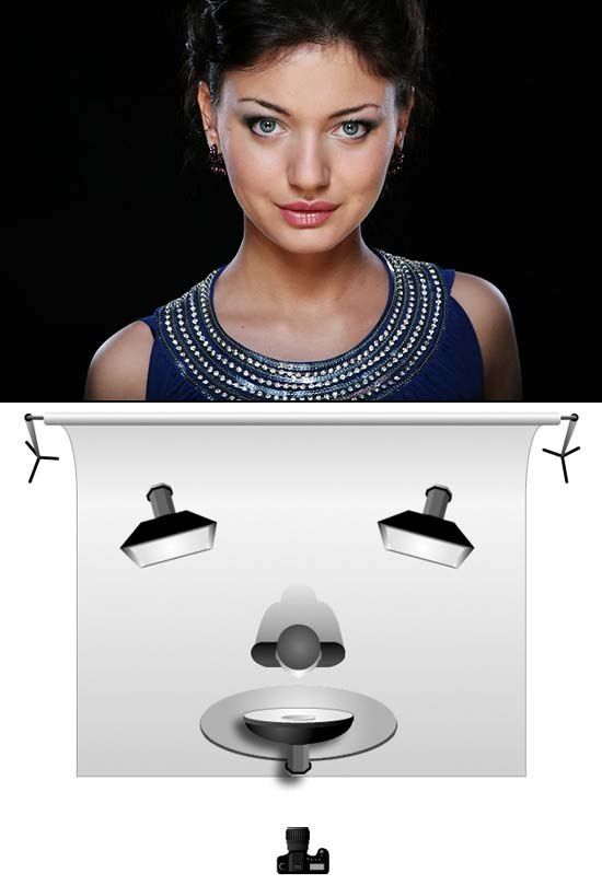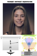 Две студийные вспышки расположены сзади объекта и немного выше него. Оба они укомплектованы 20-градусными сотовыми насадками и направлены на боковые стороны лица. Освещенность от них была на одну ступень диафрагмы больше, чем от софтбокса