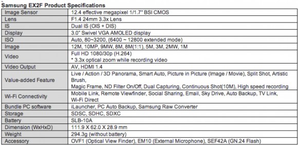 Новинка оборудована КМОП-сенсором размером 1/1,7 дюйма, при этом зум-объектив один из самых светосильных в классе — F/1,4-2,7. Лучшие показатели только у Panasonic Lumix DMC-LX7 — F/1,4-2,3, однако даже приблизительная стоимость данного фотоаппарата в СНГ пока неизвестна, поэтому трудно проводить хоть какие-то параллели. Также Samsung EX2F может похвастаться наличием встроенного Wi-Fi-адаптера, функциональность которого гораздо шире, чем просто отправка отснятого материала на ПК. Ну и это ещё не всё — камера оборудована поворотным AMOLED-дисплеем с разрешением 614 тыс. точек. Впрочем, было бы удивительно, если бы мировой лидер в производстве AMOLED-матриц не интегрировал их в свой топовый компакт, ведь это выгодно отличает тестируемую камеру от конкурентов. При этом цена на камеру остаётся вполне демократичной — в США она продается чуть меньше чем за 500 долларов.