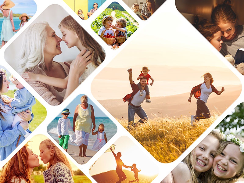 В коллажах можно комбинировать видео и фотографии, добавлять анимацию и заголовки в разных стилях, а также выбирать цвета рамок. Имеется встроенная библиотека мультимедиа с изображениями, музыкой и видео, а также сотни наклеек и GIF-файлов. Помимо коллажей, вы можете создавать логотипы, обои, доску настроения и даже меню.