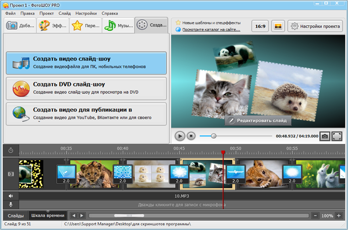 Приложение для создания видео из фотографий с наложением музыки. Позволяет накладывать эффекты, переходы и титры, регулировать громкость фоновой музыки.