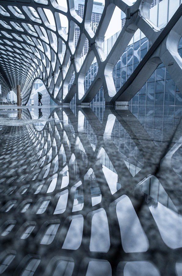 В современных районах городов много зданий, состоящих полностью из стекла и бетона. Они создают фантастические отражающие поверхности, которые также предполагают использование таких композиционных приемов как симметрия и узоры. Кроме отражений на зданиях можно использовать лужи, различные водоемы, солнцезащитные очки и окна транспорта, чтобы сфотографировать здание в отражении.