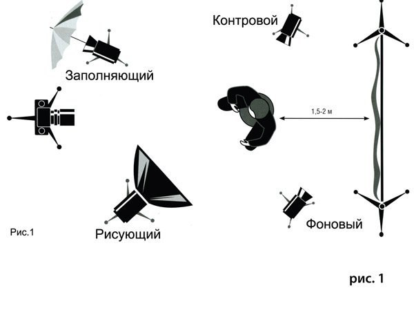 Рисующий – основной источник света, создающий светотеневой рисунок. Мощность рисующего источника света всегда должна быть больше заполняющего. Как правило разница между теневой и освещенной стороной для цветной фотографии должна быть 1-1,5 ступени, для ч.б. фото – 2 ступени и больше. Для семейного портрета заполняющий свет должен быть чуть слабее рисующего, чтобы не было жестких теней. Рисующий свет можно использовать как единственный источник света, либо комбинировать с другими.