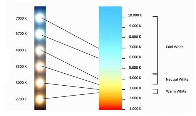Цветовые температуры до 3300 K относятся к теплому белому цвету. Диапазон от 3300 до 5300 K соответствует нейтральному белому, а температуры выше 5300 K называют холодным белым.