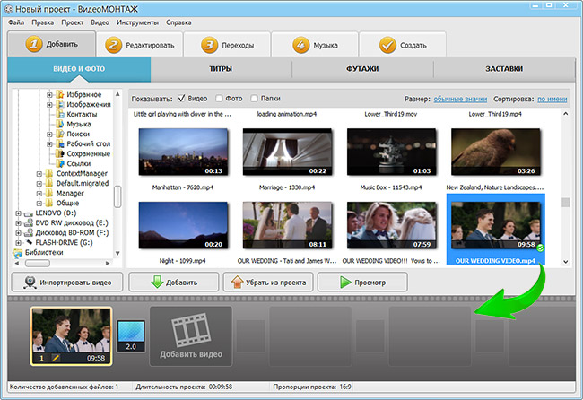 - В библиотеке проектов нажмите кнопку «Добавить», чтобы добавить видео, которые вы хотите объединить.