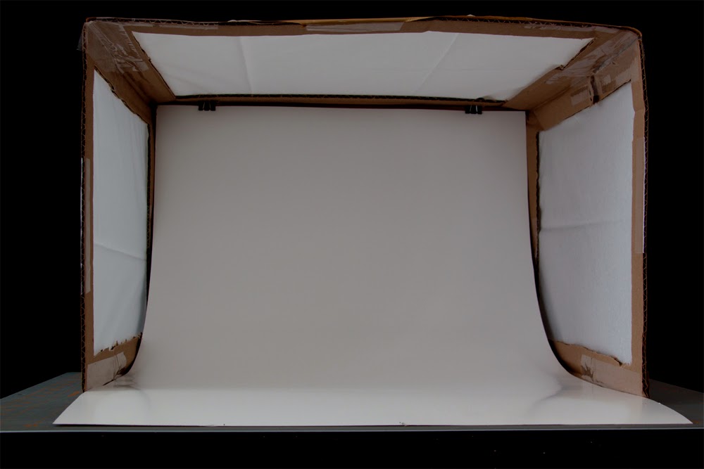 Современные специальные фотобоксы для предметной съемки стоят весьма недешево, и покупать их для разовых работ дома не имеет совершенно никакого смысла. Давайте попробуем сделать такой фотобокс своими руками из того, что можно найти в каждом доме. Ну, хотя бы из обыкновенной картонной коробки и листа ватмана. На этой фотографии вы видите один из вариантов изготовления такого самодельного фотобокса.